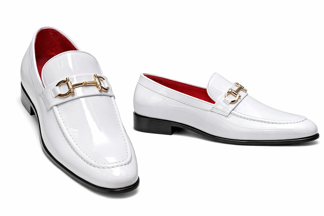 Step into refined elegance with the Terroni White Patent Horsebit Loafers. Crafted with a high-gloss...