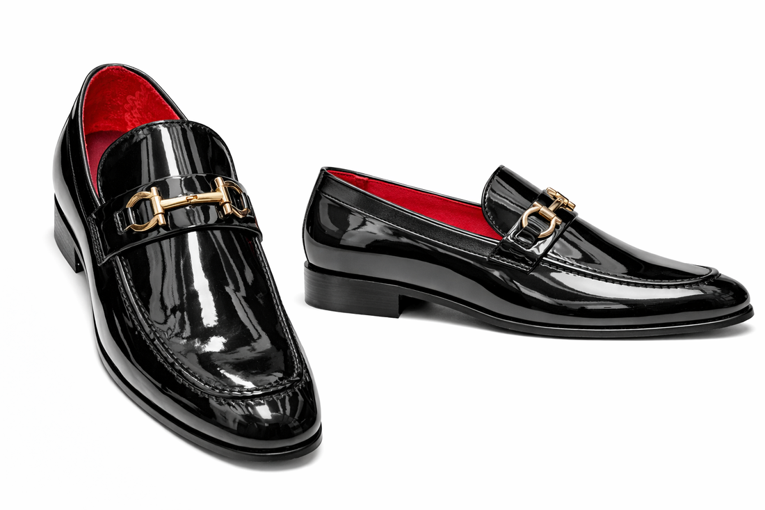 Elevate your formal wardrobe with the Terroni Black Patent Horsebit Loafers. Crafted in high-gloss black...