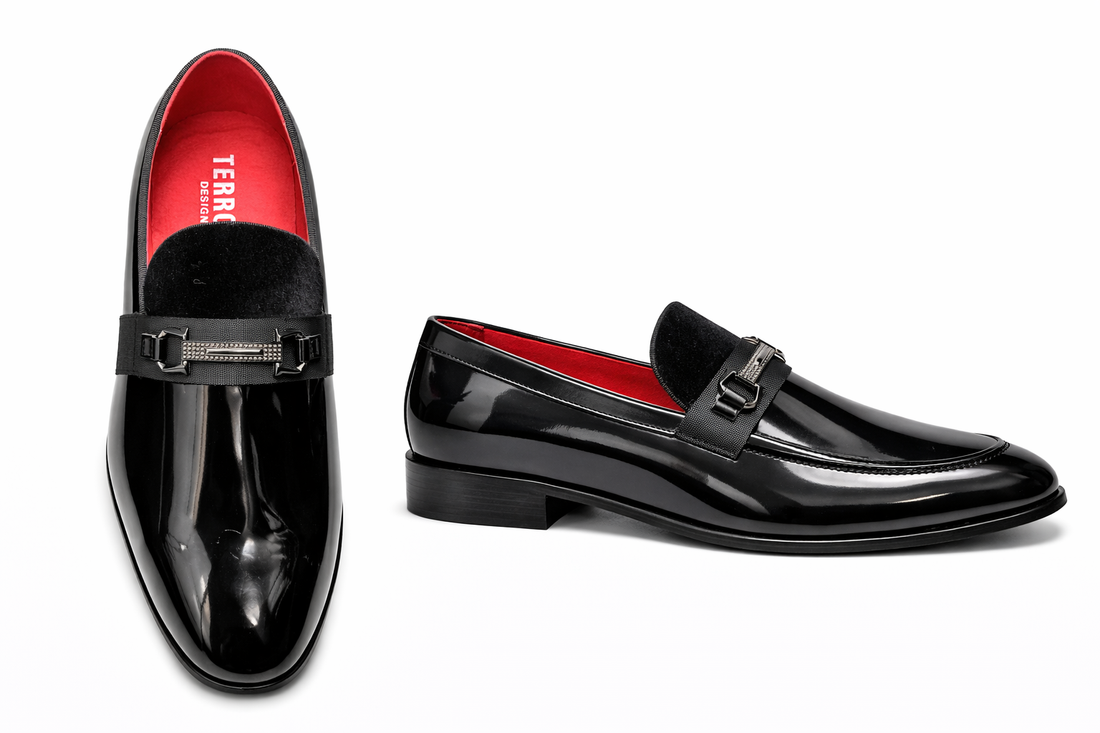 Elevate your formal style with the Terroni Black Patent & Velvet Strap Loafers. Featuring a...