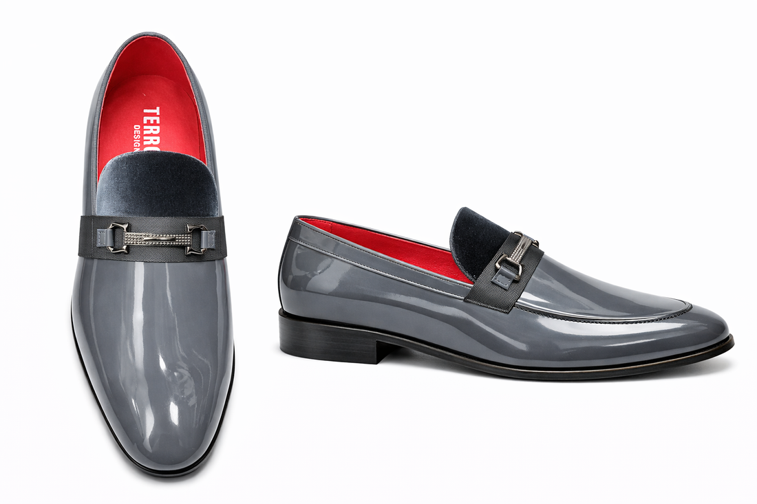 Step into modern sophistication with the Terroni Gray Patent & Velvet Strap Loafers. Featuring a...