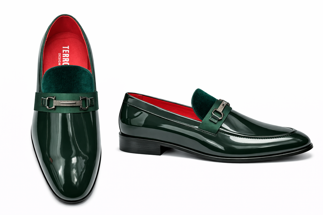 Make a refined statement with the Terroni Dark Green Patent & Velvet Strap Loafers. Featuring...