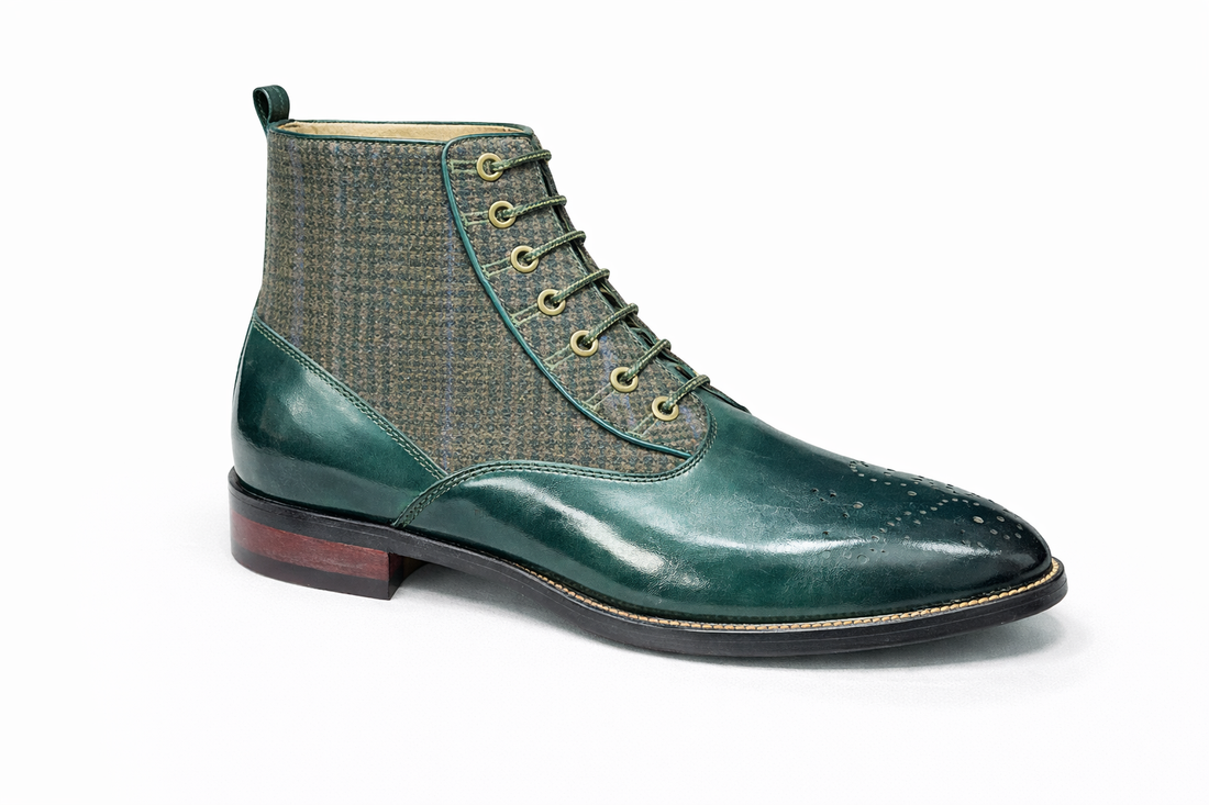 Stand out with confidence in the Giovanni “Kendrick” Leather Boots in Emerald Green Twd. Crafted...
