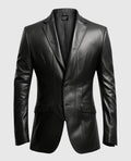 leather blazer with a single-breasted design, featuring a two-button closure and sharp notched lapels. The sleek, smooth leather finish offers a modern and sophisticated look, while the tailored cut enhances the silhouette for a refined fit. Complete with flap pockets and buttoned cuffs, this blazer is perfect for both formal occasions and stylish night outings, blending timeless elegance with a bold, contemporary edge.