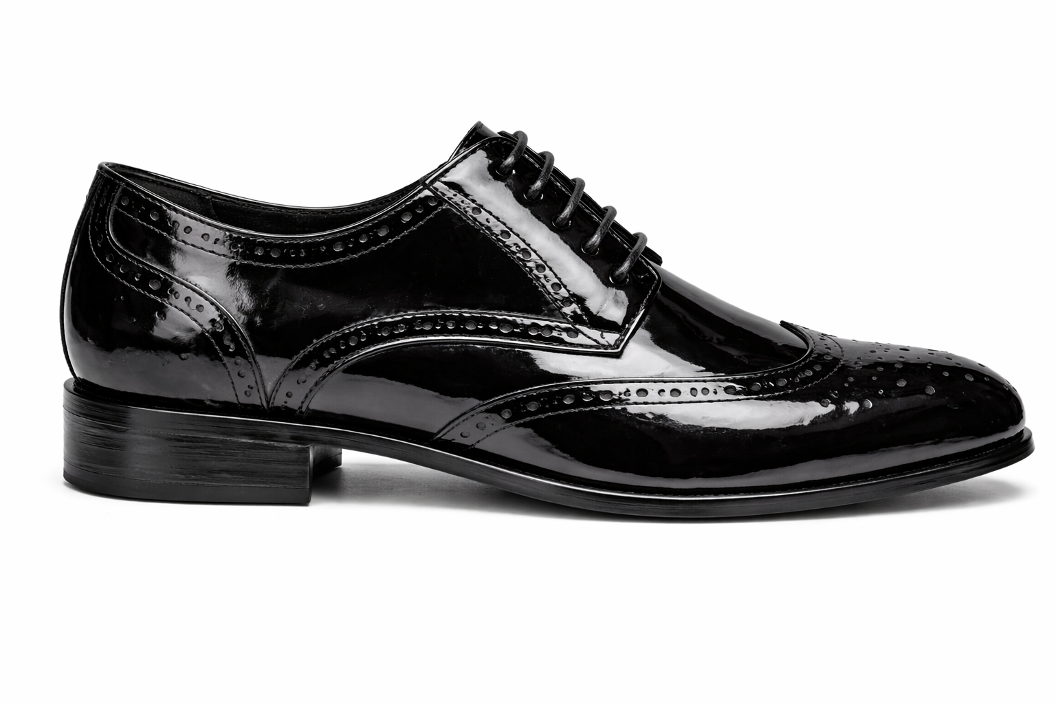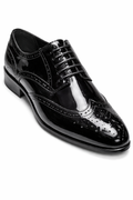Refine your formal look with the Terroni Black Patent Leather Brogue Oxfords. Designed with a high-gloss patent finish and classic wingtip detailing, this sleek lace-up delivers timeless sophistication with modern shine. The intricate perforated brogue accents add depth and character, making it the perfect choice for weddings, black-tie events, prom, and upscale occasions.